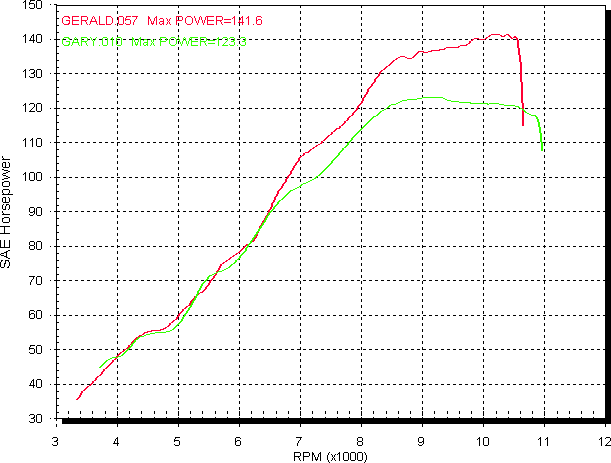 996SPS with bigger valves and more compression - Written 10/09 Summary: 996SPS fitted with 37/31 valves by CJS, 748R inlet cams and Pistal high compression pistons. A customer sent his race bike in to have some heads fitted that Chris Steadman at CJS had ported and fitted with 1mm bigger valves on both inlet and exhaust. He also had a collection of cams and some Pistal “Racing 2000” pistons. These pistons have std sized valve cut outs and fairly big domes on them (for a Ducati 4V piston) and give around 14:1 compression I’m told. I didn’t check as there wasn’t a lot of point. The std sized valve cut outs mean you can’t run any of the big cams such as G or the 4xx series Corsa cams as they have far too much lift at TDC overlap, but as we weren’t intending to that was fine. It went together with 748R inlet cams fitted instead of the SPS cams, as Chris thought these might work better with their 1.7mm higher lift. The 748R inlet cam has more lift than the SPS inlet, but 7 degrees less duration and overall I’m not sure if the differences don’t cancel each other out so to speak in this larger capacity motor. But it certainly wouldn’t hurt, and this combo is one that Bruce Meyers seemed to like. We didn’t run the 748R exhaust cams as the owner was quite happy to have a sub 11,000 rpm rev limit and they tend to promote higher rpm power at the expense of midrange. The cams were set to 114/110 centrelines, which gives an inlet closing about the same as a 996SPS inlet cam set to 110 degree inlet centreline. I also fitted MBP collets to the valves along with light closing springs and the bike had previously been fitted with an Akrapovic 45 60mm tapering exhaust system and had the throttle bodies bored to 54mm. I fitted my “96SPS with modified cam timing” eprom as a start off and set the fuel pressure to 3.5 bar via an adjustable regulator. I took it to the dyno to do some mapping runs and was quite happy with the result. Chris had done a similar bike previously which had made 145Hp with the DIN correction (which is the same as 141Hp with the SAE correction) so we were pretty much on the money, dyno to dyno comparisons aside. The comparison below is with a std head 996SPS running 107/107 cam timing. Over 7,000 rpm it’s a nice increase. The first group of runs that I did I ran it into the std rev limiter around 11,500 or so as I wanted to see what the power curve looked like. Turns out it peaked at 10,300 and fell away thereafter, so pulling the limiter back to 10,600 was good all round. I did a few WOT ignition timing runs and even with all that comp it liked 40 degrees over 9,000 rpm and at least 37 under that. Pulling it back to 34 degrees dropped the power from 5,800 rpm upwards. Maybe the 748R inlets are a bit short over 9,000 rpm for this capacity and that’s why it wants more timing up there than I expected. Compared to a 998S and 1098 it’s pretty good, which is what the owner wanted as the 996SPS is a bit slow these days with the 1098s around. Added to the graph above are a 998S with slip ons and reset cam timing in blue and a 1098 with full 70mm system and reset cam timing in yellow. It’s certainly put some more life into the old SPS.