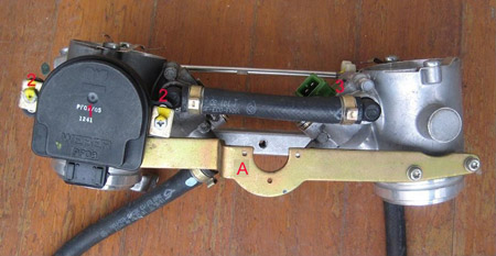 4V Desmoquattro Non Linear TPS Baseline Adjustment (plus ST3) - Written 06/08 Summary: How to set up 4V throttle bodies with the Non Linear TPS. Extra photos that I didn’t have provided by Jan Krohn, Rich “Jasper” Bower, “Duc Wilder” Troy and Mike Currie from the 851/888 Yahoo list. TPS fitment across all 4V models NOTE: READ THIS BEFORE YOU HOOK UP YOUR DIAGNOSTIC SOFTWARE AND START PRESSING “TPS RESET” LIKE A CHILD WITH A NEW TOY. Non Linear: 748, 851, 888, 916, S4, ST4, 996, S4R (Desmoquattro), ST4S. Linear: 749, 848, 999, S4R (Testastretta), 1098. Unlike the 2V models which have a bolt on Linear TPS, most of the 4V models have it fixed (peened over, etc) into the throttle bodies themselves, and are not replaceable as such. Two different sets of throttle bodies have been used on the Desmoquattro 4V engine bikes since the release of the 851 in ’88. Both have been available in either single or dual injector configuration. All 851 and 851/888 SP models up to the release of the 888 in 1993 used the first style. The photos below show the features of these throttle bodies. In the photos you’ll notice I’ve numbered all the parts we need to know about in series across all the photos. That way, if I give a number, you know which part I mean. Some parts are denoted by letters these are used so as to not confuse the TPS setting procedure, which is laid out for both types of throttle bodies.