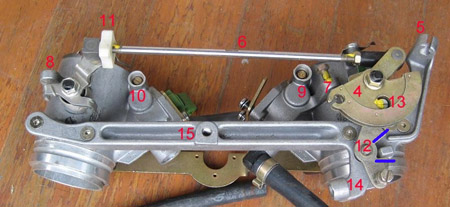 This photo was supplied by Mike Currie on the 851 Yahoo list. You can see the old style red TPS (1) these throttle bodies have. And, as you can see, no air bleeds. The throttle linkage rod on these is adjusted undoing the nuts at either end (one end is LH thread) and rotating the rod and then tightening the nuts. It’s as annoying as it sounds, and can be very frustrating when it just doesn’t want to work, trying to get your hands up under the fuel tank, etc. The second style throttle bodies have been used on all models from 888 onward, finishing in ‘06 with the last of the Desmoquattro engine S4R Monsters. These also come in single or dual injector styles, and feature injectors that fit into the throttle bodies, with only the connector protruding. 888, S4, S4R, ST3, ST4 and ST4S models have a fast idle mechanism. 888, S4 and S4R models have a fuel pressure regulator mounted on the cross bar. All other models have the regulator in the fuel pump plate mounted in the bottom of the fuel tank. The balance or synchronisation adjustment mechanism varies from two different types of rear throttle wheel screw adjustments on 888 and the large white nut on 916 and later models. In the following photos you’ll notice I’ve numbered all the parts in the same series as the 851 throttle body photos above. That way, if I give a number, you know which part I mean.