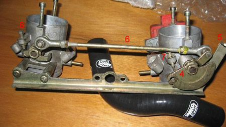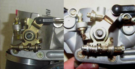As stated above, the 888 throttle bodies have a rather intricate balance adjustment set up on the rear butterfly shaft different to all the others. There are two versions of these as well, with the adjustment screw and its opposing sprung counter stop reversed on the dual injector 888SP5 throttle bodies. The two photos below show the two different set ups that I have seen. 888 on left, 888SP5 on right