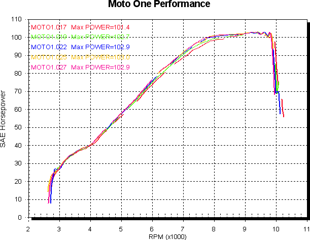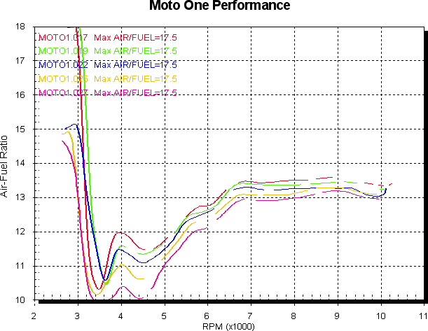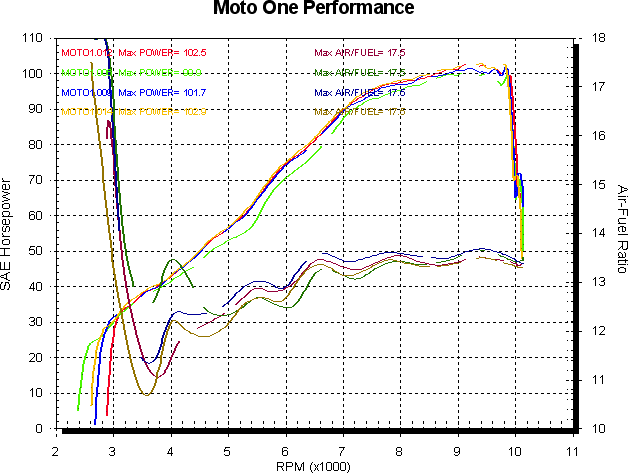 Next I fitted an air filter kit and tried the same idle trimmer changes to see what happened. Red is mufflers and air filter kit without idle trimmer change. Green is trimmer raised 10 points, blue +20 points, yellow +30 points and pink +40 points. Adding 40 points is not at all practical in reality due to the effects it has on idle and low speed running however. Power is first, then air/fuel.