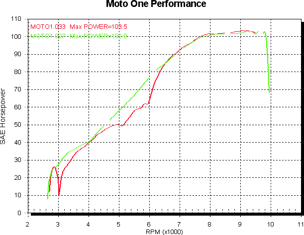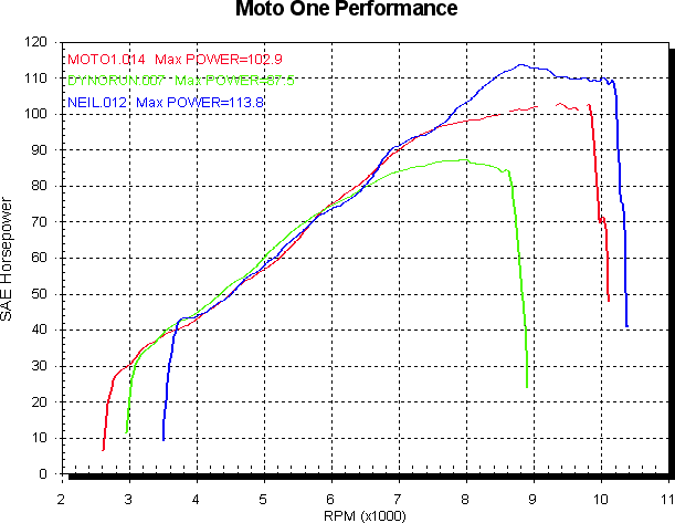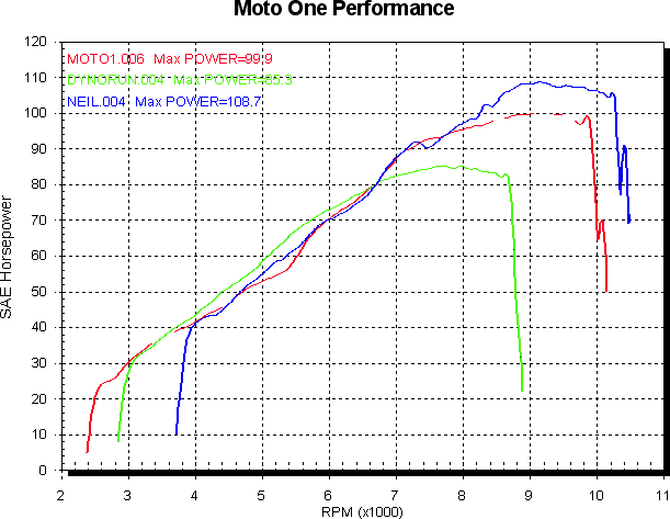 So, the less said about that the better really. Next we’ll compare the ST3 to its 1000cc mates, the 1000 ds and the ST4S. I only have one set of all std runs for each model, and they do vary a bit (as the 1000SS U59 report shows), but we’ll have to make do. The same three bikes will be used for all states of tune. First up all std. Red is ST3, green is 1000SS ds, blue is ST4S. The advantage of more valve area is shown fairly clearly. I’m not really sure why the ST3 is fitted with two 34mm inlet valves where the ST4S has 36mm, but the ST4S has 4mm bigger bore for less shrouding and (more importantly) a bigger reputation to uphold. So maybe the ST3 is held back a little for that reason. The 1000SS ds has a single 45mm inlet valve for comparison. The ST3 also has 40mm headers not 45mm as the ST4S does, and I imagine that should be worth 3 or so at the top end too at this power level.