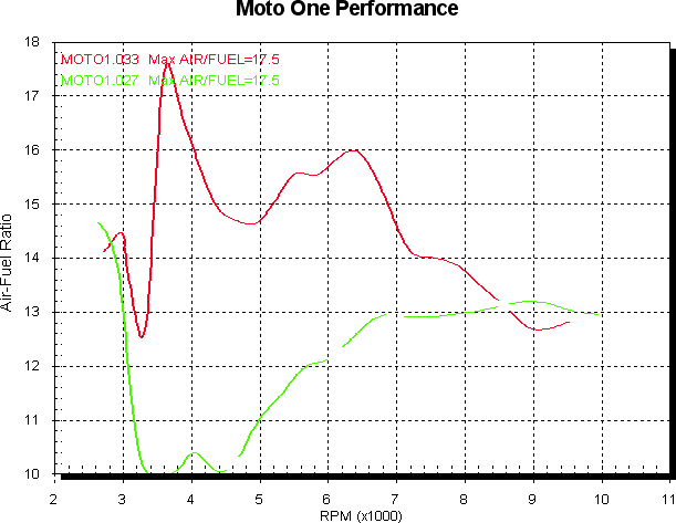 When I fitted the mufflers I ran the bike with the same trimmer setting then started increasing it to see if more fuel helped. The next graph shows all std again in green. Blue is mufflers fitted and no idle trimmer change. Red is idle trimmer raised 10 points. Yellow is idle trimmer raised 20 points. As you can see there’s not a lot in it, but it does appear to like the extra fuel. As you can see from the air/fuel trace it’s not doing a great deal to the mixture however. Although, adding even 20 points has a significant effect on the idle mixture so it seems the ST3, like the 800SS/M, is a clear candidate for a replacement ECU. Not that fitting the mufflers has made a real difference to the air/fuel mixture, which surprises me a little given the gain in midrange.