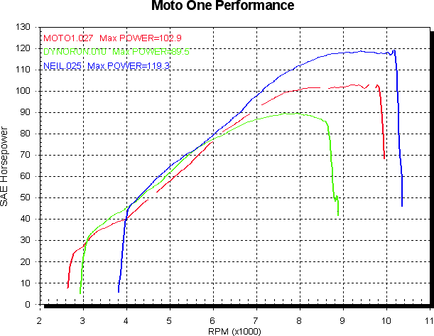 Next we fit some mufflers. Again, red is ST3, green is 1000SS ds and blue is ST4S. This tends to even things up at the bottom end, although the 2V engine still has a slight advantage.