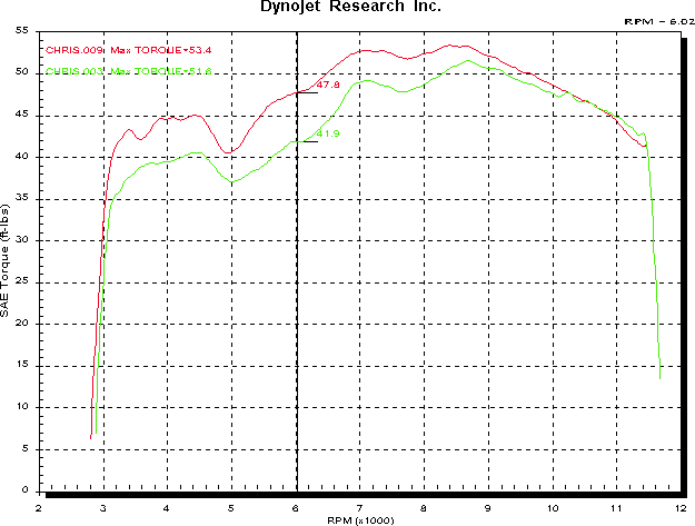 Dynograph courtesy of DYNOBIKE (03) 9553 0018 A great all round result that was better than I could have hoped for. The bike is now much nicer to ride around in an everyday sense, with more general go. Very smooth still, which has always been an attraction of the 748/750 engine size. It should also be better for track use, giving much more acceleration out of corners and onto the top end. Update 09/02 I got to do another 748 recently, the result of which is also posted in the 45 50mm exhaust report. This one differed in two ways it had Termi 45mm slip on mufflers and some over trumpet air filters. The torque curve below shows the difference. The red and green are from the graph above. The blue line is the other 748. The smaller exhaust/muffler combo really pulls up the bottom end - @ 5,000 RPM thats nearly 20% more. On the road you feel it as a long, flat torque curve. Some mightnt like it because it loses the 748s traditional top end rush, but if you want to go fast, this is where its at. The top end loss may be due to the filters, but I didnt get to try that out. This bike had carbon air runners anyway, so this is the best filter option.