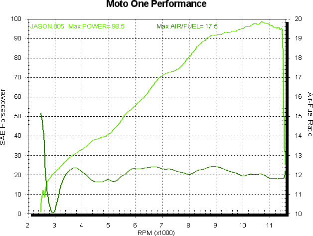 The next graph is the power and air/fuel for this bike before we played with it. The air/fuel is a fairly flat 12:1, a touch on the rich side.