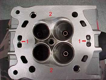 For those wondering why the 999S was in bits it had thrown a chain and done lots of nasty damage cases, gears, alt cover, etc. And yes the exhaust valves are very light in colour. It was running a Termi full system (54 or 57mm, not sure) with ECU. Anyway, you need to modify std 999 head gaskets slightly to allow the passages to flow into each other and I bevelled/sharpened the divider between the two head passages a little to work better with the single port on the 999 cylinder. Apart from that it’s fit and away you go. We used 0.2mm base gaskets from the 998/999RS catalogues to get the squish down to a nice 1.0mm. Plus we opened the chambers around the outside of the valves to unshroud them and ran a cutter down through the seats to reduce the width and make them flow a little better. As for valves sizes the 749 has bigger valves than a 996, so there’s no drama there. The photo below shows the modified head ready to go. The number ‘1’ shows the bevelled coolant transfer ports, ‘2’ the modified chamber sides.