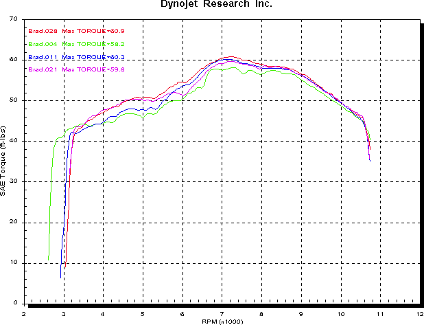 The first curve is power, 851 with std 888 mufflers and open airbox in green. 851 with Termis, open airbox and Ultimap chip in blue. 888 std with open airbox and zoned Megazone chip in purple, 888 with Staintune slip-ons, open airbox and zoned Megazone chip in red. I didnt have a std airbox lid for the 851 back then, so thats why all curves are for open airbox. The 888 mufflers dont give a dip around 6,000 RPM that the std 851/900SS mufflers give. Both the 851 curves are a bit patchy usual RPM pick-up deal.