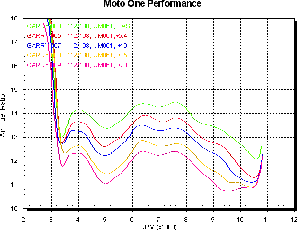Back to the story. The ST4S and S4R come from the factory with single injector throttle bodies, the same injector as the ST4 and S4 in fact. Maybe with the shorter duration inlet cam they felt the high RPM operation would be a little less demanding, but I’ve seen ST4S make as much power as any equivalent 996 Strada, so I don’t see any logic in that theory. Rev limiting them a bit lower can also avoid this issue somewhat, but that’s also a pretty good idea for any 4V engine’s general health anyway - valve collets in particular. Update 01/07 I thought I’d add a couple of graphs showing air/fuel ratios with RPM from a couple of bikes I’ve done, just to show what happens when they get to the point where they are injector restricted. These are all bikes I’ve run on the dyno with some sort of altered cam timing. One benefit of the advanced inlet cam timing we run on most engines is that it brings down the volumetric efficiency after the power peak. This reduces the need for fuel right about where a single injector may be a problem, so it’s rather convenient. All I’m showing here is air/fuel curves. I do a set of runs when possible to see what the engine wants in terms of air/fuel ratio and to get a picture of the power curve. Some of these graphs show very rich or lean mixtures don’t worry about that. If I showed you the power curves you’d see corresponding dips where those mixtures occur. First up is a 916 running 112/108 cam timing and an Ultimap UM071 eprom. Green is no added fuel, red +5%, blue +10%, yellow +15% and pink +20%. As you can see, it’s going rich above 10,000 RPM anyway. Adding 5% makes a difference, but then from about 10,200 RPM upward the richer curves begin to converge as we run out of injector time. The power peaked on this bike at 9,100 RPM, with the torque curve peaking at 6,800 RPM, although it was somewhat flat to 8,500 RPM when it started falling away.