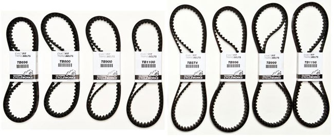 EXACTFIT Timing belts - Updated 5/20 Brad The Bike Boy is the Australian distributor for the EXACTFIT range of timing belts from California Cycleworks. These belts are exact duplicates of the OE belt in every way utilizing the same core materials, the same rubber exterior, the same inner facing weave and exactly the same tooth profile. The manufacturer is a US based global supplier of a wide variety of belt for transportation OE applications and has extensive experience making automotive timing belts for many major manufacturers. The belts themselves are made in China. For some more info click here for the California Cycleworks page. The EXACTFIT range covers every Ducati belt drive model including the square tooth belt 500, 600 and 750 engines (all pre 1998) and the 748R (same as TB996, but 2mm wider). The replacement schedule for these belts remains the same as the Ducati specification of 2 years or 20,000km, whichever comes first. Fitment is as below. Prices include GST. Trade enquiries welcome.