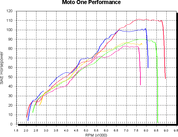 Just like the 1100 and 1150 RS spec engines, the ST engine doesn’t require it to be revved right out to give good performance, making good power all the way through the RPM range. It’s quite a nice engine to use. Next we’ll compare them all on one graph. 1100S is green, 1200S is red, 1200ST is blue, 1150RS is yellow, 1100Rs is pink.