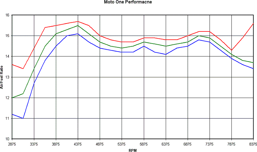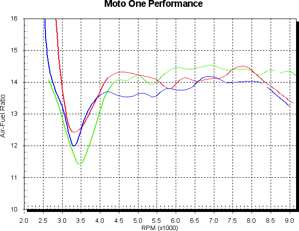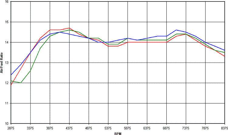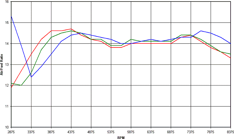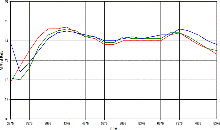 For the next graph we add the Dynojet air/fuel trace to the averaged on-road and on-dyno graph. Remember this Dynojet trace of air/fuel is for a roll on acceleration run, not a held RPM run, so it mimics the on road situation well. Red is logged on-road average, green logged on-dyno average and blue is the Dynojet trace, read off the Dynojet Winpep software generated graph of Air/fuel vs RPM. You can see the Dynojet graph shows a somewhat consistant lag compared to the green on-dyno log.