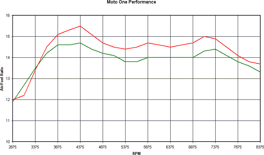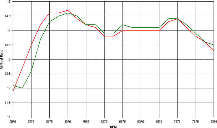 S2R 1000 On road and on dyno Tech Edge Wideband data log results - Written 05/08 Summary: More S2R results and a comparison of on road and on dyno air/fuel logs from the Tech Edge Lambda controller and data logger and Dynojet dyno air/fuel probe. I’ve been using a Tech Edge 3A2 Wideband unit (lambda controller and data logger) - http://wbo2.com/3a1/default.htm -and have been running it on our demo S2R 1000. All the information you see below has been interpreted using the TEWBlog software as developed by Justin ‘The TEWBlog guy'. The information has been copied out of the TEWBlog “matrix” function and into a MS Excel spreadsheet, where it is easily manipulated into graphs. The “matrix” function is only available once you’ve registered the TEWBlog software, which you do by giving Justin an insignificant amount of money to help compensate him for the time he spent developing it. If you want to use the output of the logger to develop maps or map corrections you need the “matrix” function, and besides that it’s a very nice way to display any logged data. We took the S2R out and logged some WOT runs, with the set up being Moto One header pipe, Staintune mufflers, std air filter and std ECU with Lambda sensor disconnected. Then I took it to the dyno (hadn’t dynod this combo before) and ran it with both the Tech Edge unit and the Dynojet air/fuel probe. The first graph below compares the on-road Tech Edge log to the on-dyno Tech Edge log, with the values shown being the average values. The on-road logs had between 25 and 35 samples for each WOT RPM range, whereas the on-dyno results had between 8 and 13 (5 dyno runs in total). Red is on-road, green is on-dyno. I’ve stopped the graphs at 8,375 RPM, meaning any info over 8,500 RPM I’ve disregarded. This is due to the rev limiter induced wackiness that I couldn’t be bothered taking out of the log file. This might sound lazy, but when you consider the unit logs 10 times a second and can log around 45 minutes or so (up to 1 Meg of internal memory) it’s a lot of info to look thru.