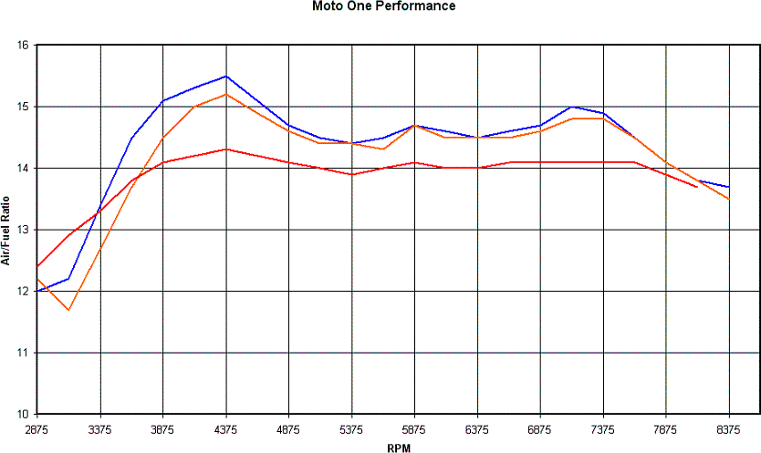 I also logged the dyno runs using the Tech Edge unit, and if you compare the yellow curve to the curves given by the Tech Edge unit for this combination, both on road and on dyno, you can see quite a difference. The two Tech Edge log curves match up quite well, but the Dynojet curve is clearly richer. The next graph shows the two Tech Edge unit logs on the road is blue, on the dyno is orange compared to the Dynojet air/fuel trace in red. The Dynojet trace is moved 500 RPM to the left as above. In this instance, the Dynojet trace is quite a bit richer. At least the on road and on dyno Tech Edge logs show good consistency (you know how much I like that).