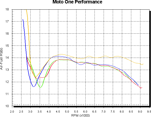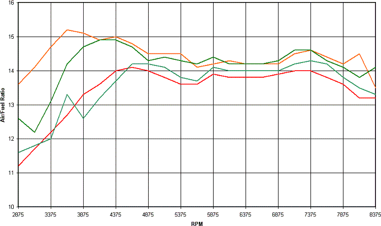 The next graph shows the above average air/fuel ratio plus the min and max as logged on road without an airbox lid. The number of samples at each data point ranged from 20 to 30 more at higher RPM as the acceleration had obviously dropped off by then. I’d say the wacky point at 8375 on the max curve could be a rev limiter induced thing.