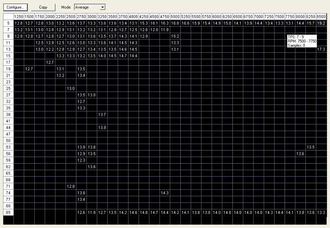 The way the “matrix” function interprets the data is that all samples within a specified RPM and throttle range are averaged to give a mean figure. These sections of RPM and throttle position can be set as desired, with up to 30 sections for each. A sample matrix is shown below. The RPM given across the top is the maximum RPM used for that averaging section. For example, 4,000 corresponds to the averaged data range from 3,750 to 4,000 RPM. Similarly for degrees of throttle opening, which increases as you go down the page. You can see the little white box at the top right which shows the info for a specific cell and the number of samples in that cell. In this case, 7 to 9 degrees throttle opening, 7,500 to 7,750 RPM, 0 samples. To use this info you just use the “copy” function which you use to copy the matrix into a spreadsheet where you can manipulate the data or drop it into a Dynojet Power Commander file or a Rapid Bike file or use it to modify Ultimap 1.5M and U59 custom files using some spreadsheets I have developed. This example is a good indication of what happens when you go out and do lots of WOT stuff and cruise in between. The log can be a cruel thing, especially at a race track for guys who think they’re really on it. You can’t hide from the data logger, and there have been a few occasions where people have been told to “open the throttle further for longer or you’re just wasting my time”. Logging the commute to work and back shows how (unavoidably) little throttle opening you use in that scenario. Generally the hardest cells to get samples for are those in the centre and centre right of the matrix as shown, and it can be almost impossible to fill them in on a straight piece of road.