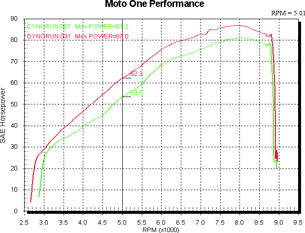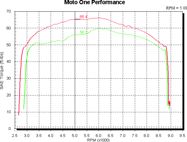 The next graphs show the start and finish - all std in green and Zard, hacked airbox lid and Dobeck (set to 11) in red. From 3,700 to 8,000 RPM it’s at least 7hp better, with an extra 9 from 4,500 to 5,500 RPM. In percentage terms that’s 15 to 20% in the bottom and midrange with 7 to 10% above that, a very sizeable increase. The torque graph following the power graph shows this very clearly.