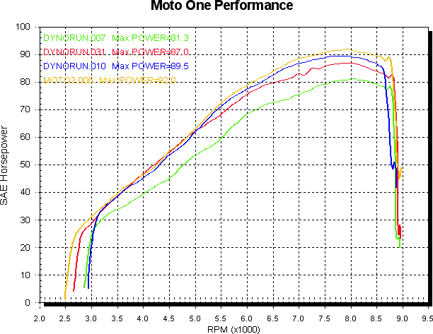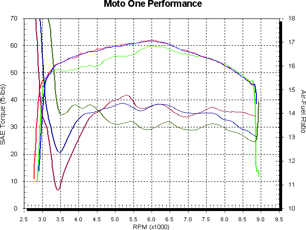 For comparison to the 1000SS, the final graph adds the two 1000SS I’ve dyno with slip on mufflers and open air filters to the above before/after graph. The Sport 1000 is still lacking at the top end, but as the under 5,000 RPM section is the same we can safely say it’s being restricted by flow in or out (what a wonderfully all encompassing and completely obvious statement huh), which we kind of knew anyway.