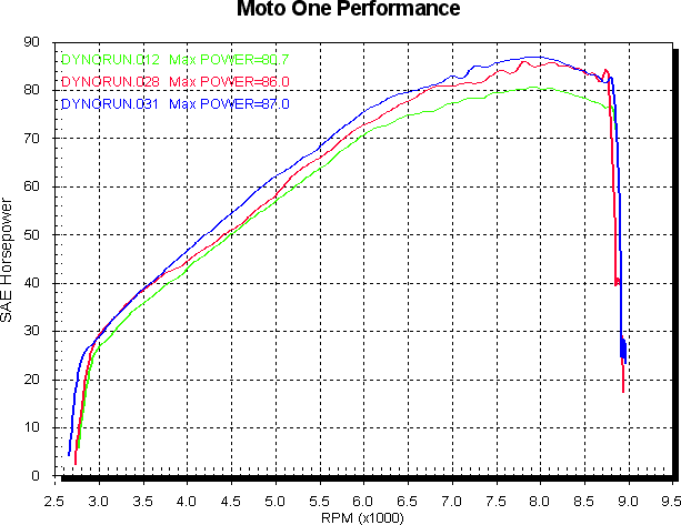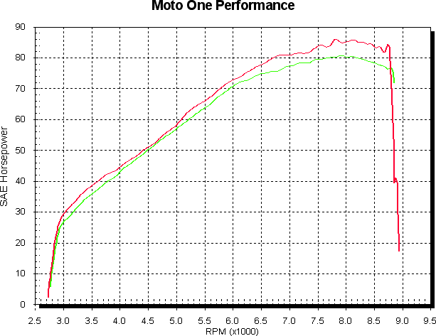 It’s rather loud, especially when you’ve got it pinned, but quite quiet when you’re cruising around. On overrun it has one of the wackiest notes I ever heard. I was hoping for a nice Bwooooooorr, the sort of thing you get from a Pantah with a Gianelli 2-1. But it’s loud and kind of poppy, but not really and not backfiring. It’s rather hard to describe. Plus you get it as you shut the throttle for gear changes, so as you cruise up through the gears you get the vroooooom baw vrooooom baw vrooooom effect. It’s a rather cool bike to ride. Ian, one of our sales men, often leaves his new R1 at work and rides the Sport 1000 home, just because it puts such a smile on his face. When I first sat on it I found it very heavy on my wrists, but after 5 or so minutes riding I totally forgot about that, so it’s a bit deceptive ergonomic wise. Fits my body just great. Now, on to the all important dyno runs. Std the bike made 80 hp, about 5 less than one of our previous 1000SS demo’s (the less powerful of the two demo’s I’ve dynod) and around a consistant 10% down through most of the RPM range. Adding the Zard system helped the midrange, but started to hurt the top end a little, maybe due to the lack of a flowing crossover. Not really the result I was expecting, but it’s always nice to be presented with a challenge. Green is all std, red is Zard fitted with no other mods. For comparison an all std 1000SS is blue.