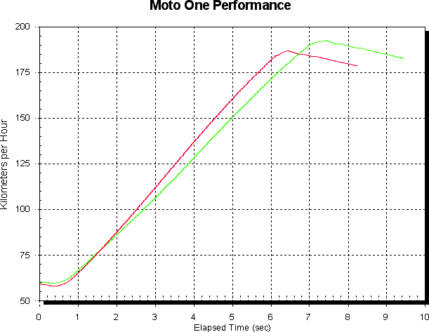 Overall, the exhaust, airbox and fuel mods have made a big difference to the Sport 1000. The following graph shows the difference in dyno roller acceleration time from std in green to all the mods in red. Both these runs were done under near identical environmental conditions, so they’re very relative. It feels much better on the road for the mods too. And, if you owned it, you’d also run a 14 tooth front sprocket at the least or change both front and rear from the std 15/38 to 14/40 or 15/43 for even more improvement.