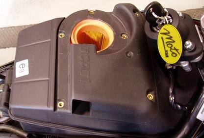 The filter is a round style, probably 60mm diameter and 180 or so mm long (that’s a very rough guess, made sitting in the lounge room tapping away on the laptop several weeks after looking at the filter). Thinking about it now, I guess a single 60mm hole feeding a bike with 45mm throttle bodies isn’t that bad, and the airbox is quite large in volume. But the inlet is still much less flowing than an SS or Monster with an open lid. So I did the obvious thing and attacked the air filter lid with a cutoff wheel. (as you do), photo below.