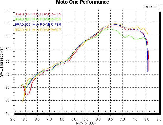 This brings the report to an end. I have heard of this bike a couple of times since I sold it. It is now back to running single plugs something about the coils I was using upsetting the ECU and runs just fine at 10.5:1 compression using the chip with modified ignition advance. Although it needed about 15% more fuel, which shows the efficiency advantage the twin plugs gave. Home | Blog | Facebook | Service Enquiry | Products | Reports | The Dyno | Disclaimer | Contact Us |