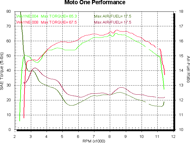 Tuono ’06 model with Mufflers, etc - Written 10/07 Summary Tuono all std and fitted with Akrapovic slip on mufflers, airbox inlet restrictor removed, K&N air filter and ECU map variant 2. This Tuono, a customer’s bike, came in for a first service and some other stuff so we took the chance to do before and after runs. One thing I was interested in was the airbox inlet restrictor, which I noticed on another Tuono we’d had in bits a few weeks before. The RSV-R, with the flapper valve in the front fairing air duct, doesn’t have this restrictor, although both bikes share the same airbox otherwise. The restrictor itself screws into the front of the airbox at the mouth of the box where it sits up against the back of the front fairing air duct opening in the main frame. The opening of the airbox is probably (he guesses, wishing he’d taken measurements) 100mm square, whereas the hole in the restrictor is probably 60mm round and bell mouthed. I had asked the question on the AF1 forum if anyone had some before and after experience with this mod. Those who replied in general said maybe a bit more noise and more surging at low speed with no real performance increase. I’d say it’s one of those things that looks bad, but in reality isn’t. It may realistically simply be a noise lowering (and hence test passing) device I don’t know. The before run shown in green is all std Tuono, running the std ECU map variant 1 (meaning closed loop) and fitted with the supplied 15 tooth front sprocket. The after run in red is with Akrapovic slip on mufflers, K&N air filter, airbox inlet restrictor removed (airbox otherwise original), ECU map variant 2 (open loop) and the idle mixture reset to 4.5 5% CO. A very good improvement over std for a modern bike with simple mods, but I thought it’d make more peak power. Power first, then torque and air/fuel.