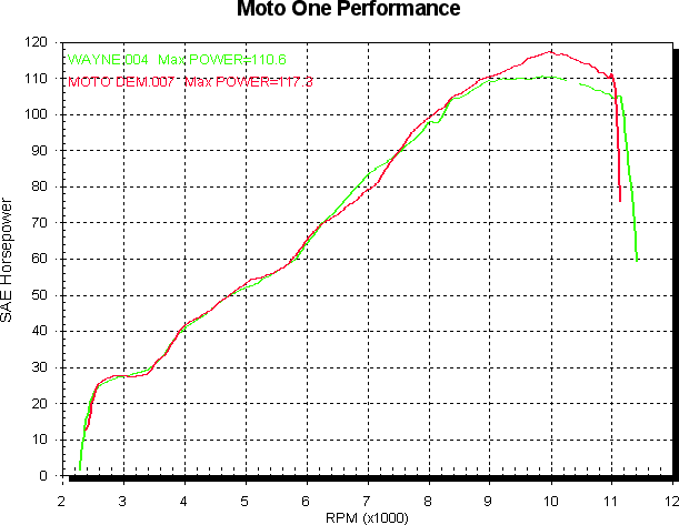 Next I’ll compare this Tuono to our old demo RSV-R. First up all std for both, Tuono in green, RSV-R red. I’m not sure why the top end of the RSV-R is better maybe the Tuono restrictor does hurt the very top end.